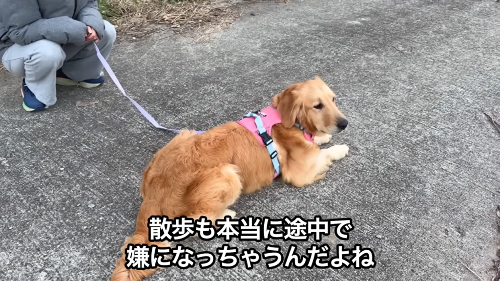 散歩をしていても途中でこのように伏せしちゃったりして、怖がっている様子でした。