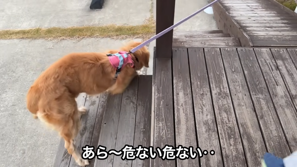 外の世界がはじめてだったので、このような段差も上り下りできず、抱っこでおろしてあげていました。