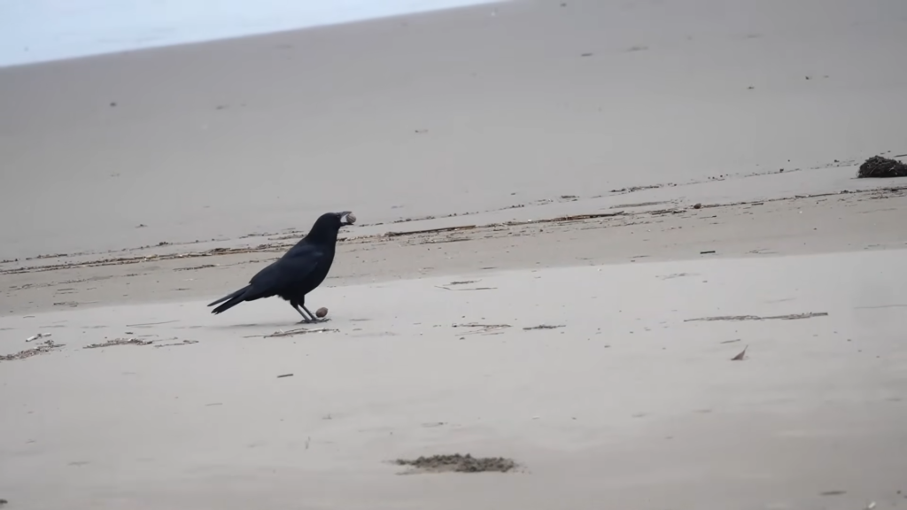 このように胡桃の味を知っているカラスも、海岸に広いにきます。